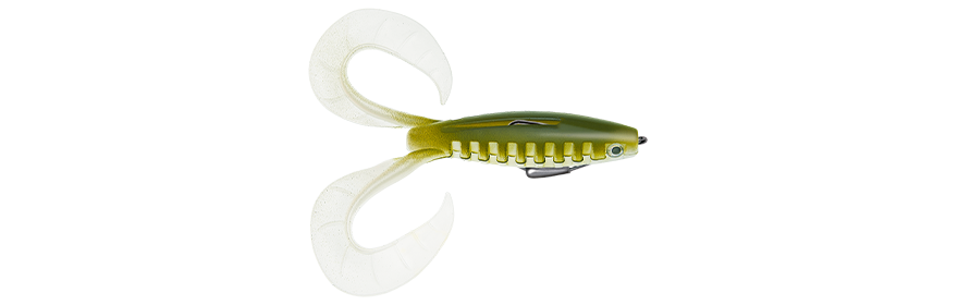 Dit Nieuwe kunstaas met dubbele staart van 12 cm is gemonteerd klaar om te vissen met een verzwaarde Texas haak systeem verzwaard met 7 gram , zowel in ondiepe gebieden op zoek naar snoek als in de lagere waterlagen om snoekbaars en grote baars te volgen. Inderdaad, zijn zeer flexibele dubbele staart is altijd in beweging, zelfs bij zeer lage snelheid, wat roofdieren niet onverschillig maakt. Door zijn weedless montage kan hij door de meest overbelaste omgevingen gaan zonder vuil te vangen. Door de brede spleet kan de Texaan perfect naar buiten komen tijdens de beet om zo een perfecte penetratie te garanderen.